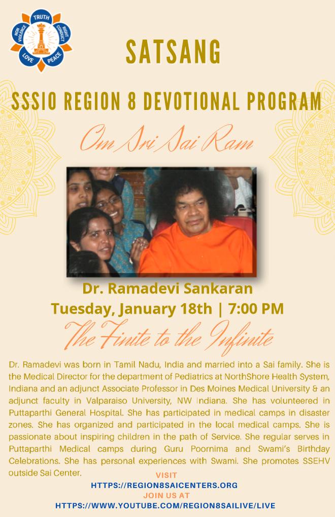 Please join us for Vedam and Bhajans followed by guest speaker Dr. Ramadevi Sankaran -The Finite to the Infinite To join the recorded stream please navigate to https://www.youtube.com/region8sai/live at the appropriate time.