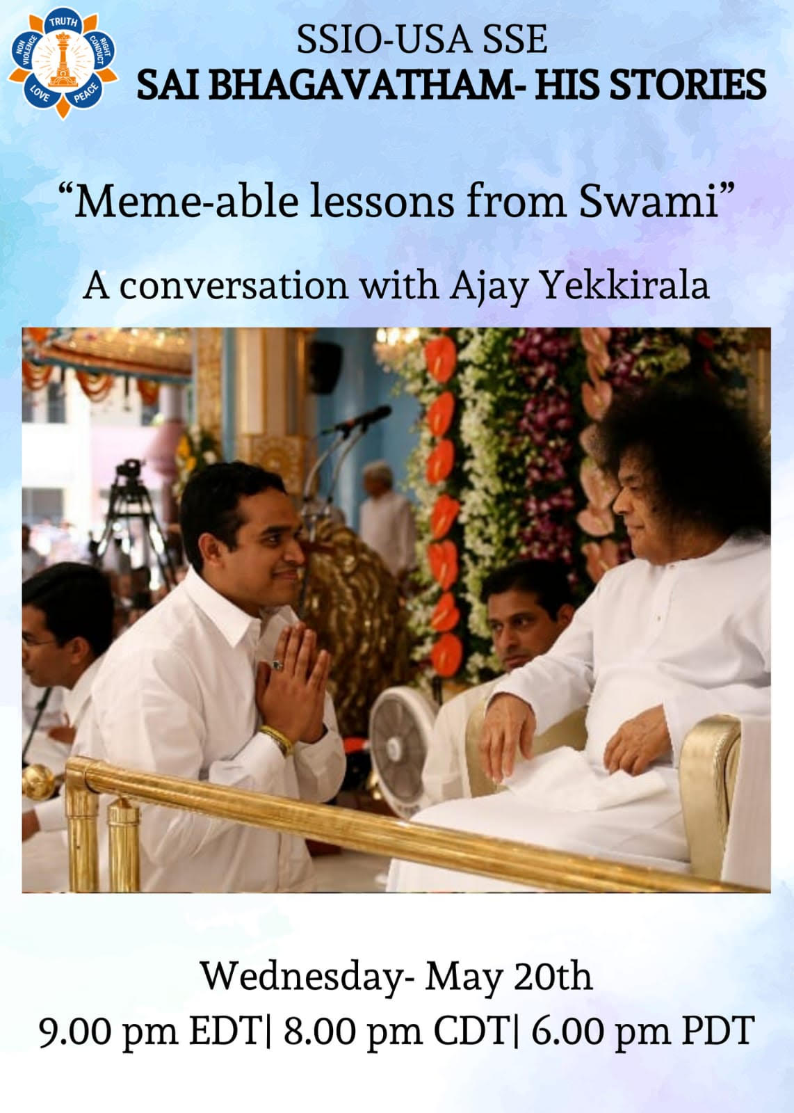 Please join us for the SSIO-USA Bhagavatam – His Stories | Episode 10: Meme-able lessons from Swami with Guest Speaker Ajay Yekkirala To join the live stream please navigate to https://www.sathyasai.us/live at the appropriate time.
